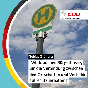 Den hierzu erforderlichen Antrag wird die CDU-Fraktion im Vechelder Gemeinderat auf den Weg bringen. Diese Busse könnten zu festgelegten Zeiten (vormittags, nachmittags oder je nach Bedarf) Hin- und Rückfahren aus den Ortschaften heraus in den Kernort Vechelde zu fairen Preisen anbieten und somit den zum Teil bestehenden Linienverkehr sinnvoll ergänzen und passgenauere Anbindungen an die Kernortschaft Vechelde für alle Bürgerinnen und Bürger ermöglichen.